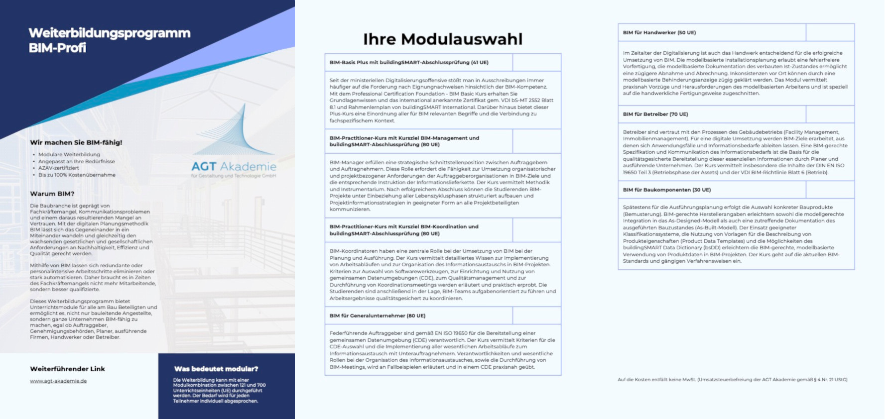 Die AGT Akademie ist Ihr kompetenter Partner für Building Information Modeling (BIM) und einer der ersten Anbieter in Deutschland, der AZAV-zertifizierte BIM Weiterbildungen mit staatlicher Förderung anbietet. Unsere Kurse verbinden praxisnahes Wissen mit einem international anerkannten buildingSMART-Zertifikat, das Ihnen den Nachweis fundierter BIM-Kompetenzen für die Bauwirtschaft ermöglicht.