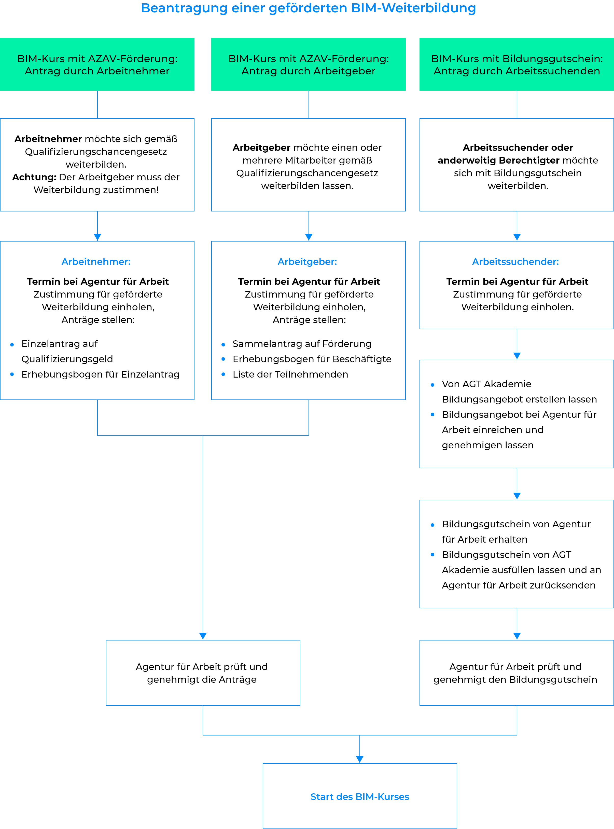 Mit der AZAV-Zertifizierung ist die AGT Akademie autorisiert, ihre Building Information Modeling (BIM)-Kurse durch Bildungsgutscheine der Agentur für Arbeit förderfähig zu gestalten. Das bedeutet, dass Ihre Weiterbildungskosten je nach Förderfähigkeit bis zu 100 % übernommen werden können. Dies ist insbesondere für Fachkräfte von großem Vorteil, die ihre beruflichen Kompetenzen erweitern und ihre Marktchancen in der zunehmend digitalisierten Bauwirtschaft verbessern möchten.