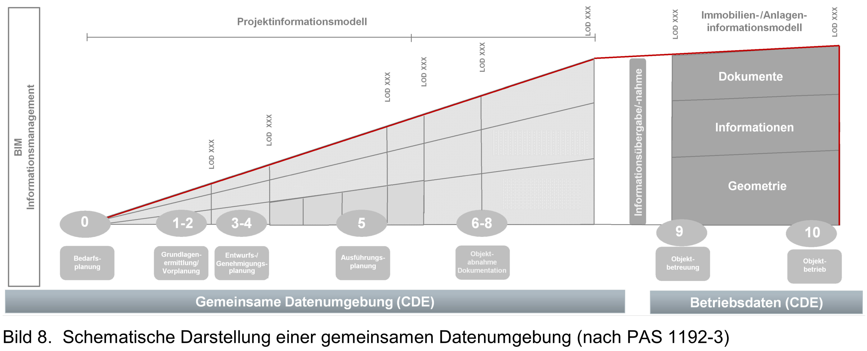 Der Richtlinienentwurf VDI 2552 Blatt 1 beschreibt mit dem Level of Development die Fertigstellungsgrade des Digitalen Zwillings der gebauten Realität. Hierbei erfolgt eine Gliederung in 5 Stufen (LOD 100 bis 500).