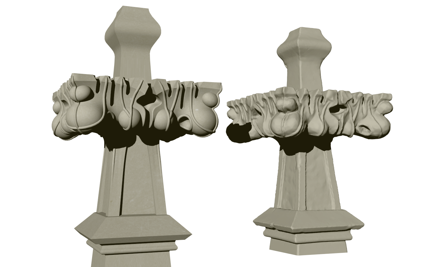 Parallel zur Bearbeitung der Kirche wurde die parametrische Modellierung eines Baldachins mit Kreuzblume auf Grundlage eines Detailscans durchgeführt, um den Ansatz der BIM-konformen Attributierung eines Bauschmuckmodells zu erproben.