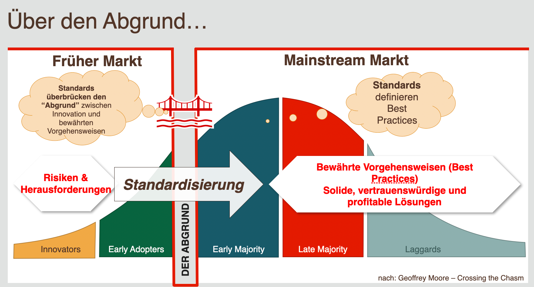 Standards helfen, um den Abgrund (The Chasm) zwischen einem sich entwickelnden frühen Markt und dem gereiften Mainstream Markt zu überwinden. Bild: Ulrich Hartmann nach Geoffrey Moore