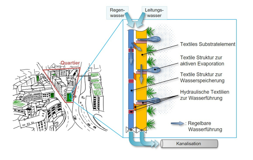 Bei Starkregen wird das überschüssige Wasser mit zeitlicher Verzögerung in die Kanalisation eingeleitet. Die an den DITF entwickelten Living Walls helfen auf diese Weise, in nachverdichteten Ballungsräumen die Ressource Wasser effizient zu nutzen.