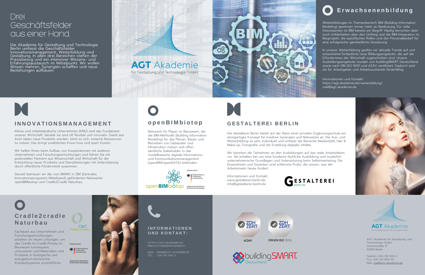 Das Angebot der Akademie für Gestaltung und Technologie Berlin gliedert sich in die zwei Geschäftsfelder Innovationsmanagement und Weiterbildung. In beiden Bereichen stehen der Praxisbezug und ein intensiver Wissens- und Erfahrungsaustausch im Mittelpunkt. Wir wollen mit unserer Akademie Wissen mehren, Synergien schaffen und neue, wertvolle Beziehungen aufbauen.